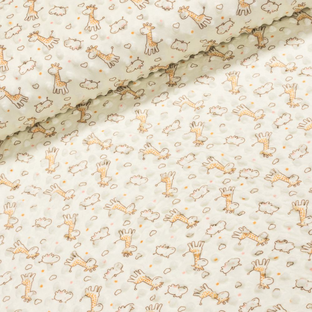 Minky fleece (mikroplyš) se vzorem béžových žirafek a hrošíků na smetanovém podkladu s vystouplými puntíky (čudlíky). Látka je v šířce 145 cm (250g/m2) a je vyrobena z heboučkého 100% mikropolyesteru s chlupem a protlačovaným vzorem (vzor i chlup je jen z jedné strany).