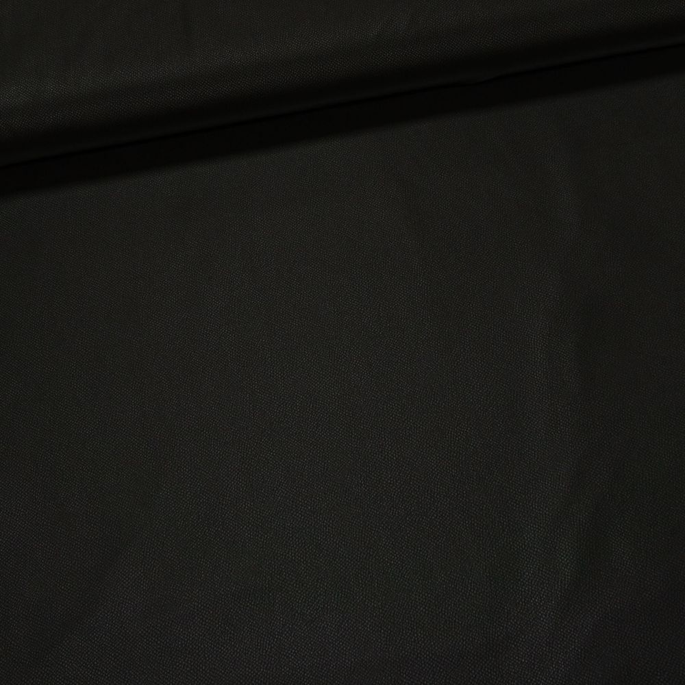 Umělá koženka elastická v černé barvě. Umělá kůže je v šířce 145 cm a je vyrobena ze 60% polyesteru, 30% polyuretan a 5% elastanu. Tato koženka je v měkkém provedení s imitací kůže, z rubu je jemná počesaná. Látka je vhodná na oděvy jako jsou saka, sukně, kabáty či bundy nebo také kabelky, batohy, peněženky a pod.