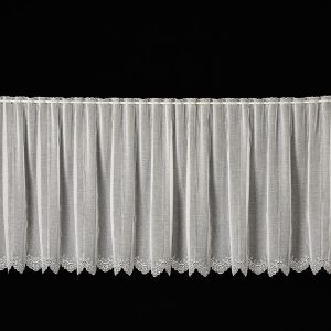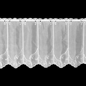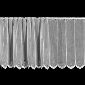 Metrážová organzová vitrážová záclona průhledná, s bílým pršíčkem a lístky, zakončená bordurou. Záclona má v horní části pevný okraj s dírkami pro navlečení na tyč.Záclona je vyrobena ze 100% polyesteru a je dostupná v různých výškách. Výška záclony je měřena v nejdelším místě.