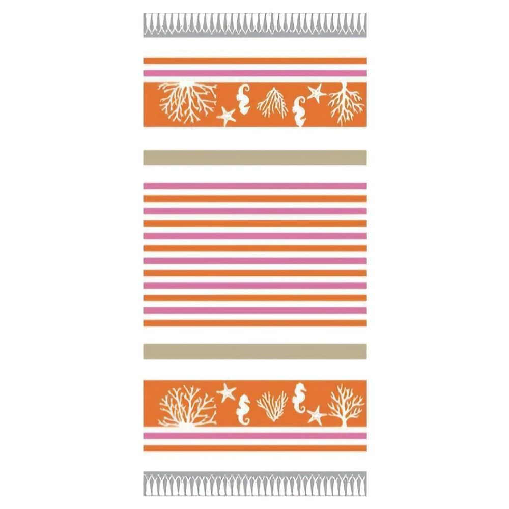 Velká plážová froté osuška se vzorem mořských hvězdic, koníků a korálu v kombinaci s oranžovými proužky s třásněmi určená nejen na pláž, k vodě nebo k bazénu. Osuška v rozměru 90 x 170 cm je vyrobena z kvalitní 100% bavlny s vysokou gramáží 310 g/m2. Osuška je z lícové strany hladká s froté vzorem mořských vzorů, z druhé strany má froté smyčku.