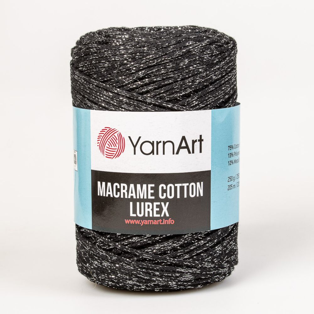 Macrame směsová pletací / háčkovací příze (75% Bavlna - 13% Polyester - 12% Metalická vlákna) v jednobarevné černé barvě s lesklým efektem. Příze je cca 2mm silná a je vhodná na výrobu podložek, obalů na květináče, košíčků, a také pro tvorbu módních doplňků - kabelek, šperků a síťových tašek. Doporučená velikost jehlice i háčku 5 mm.