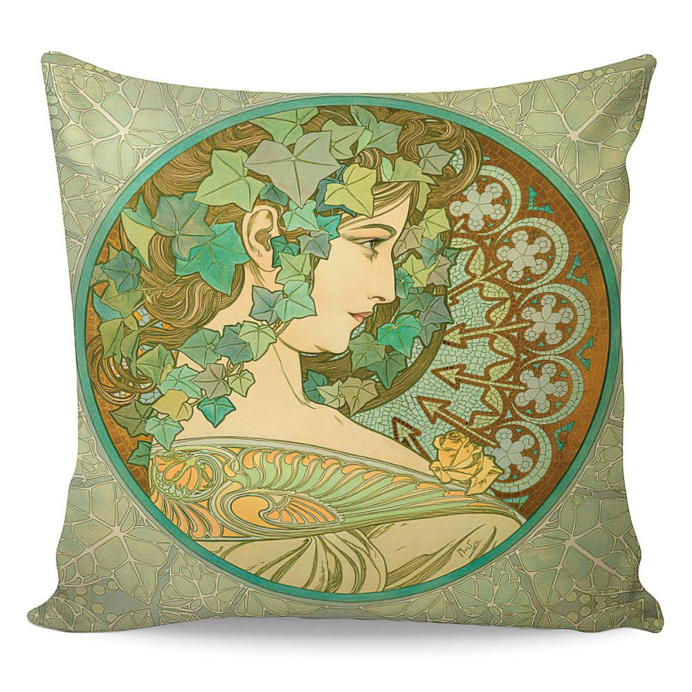Povlak na polštářek z originální kolekce Alfons Mucha v typické kresbě a motivech v zelených odstínech od výrobce Matějovský. Povlak je z obou stran stejný a je potištěný ekologickými barvami digitální technologií. Povlak na polštářek je vyroben ze 100% bavlny a je opatřen zapínáním na ZIP. Povlak je možné objednat samostatně bez výplně, s levnější dekorační výplní nebo luxusnější výplní na spaní.