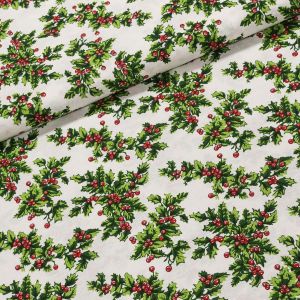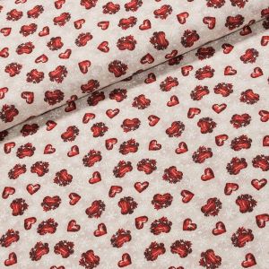 Polyesterová látka (tkanina) s teflonovou úpravou s motivy stříbrných vlnek s vločkami na červeném podkladu. Látka je v šířce 160 cm a je vyrobena ze 100% polyesteru s teflonovou vrstvou, vzor je plastický z toho důvodu látku žehlit z rubové strany. Motiv na látce je pouze z jedné strany, z druhé je látka bez potisku.