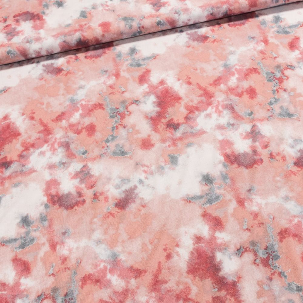 Elastický polyesterový úplet (jersey) s mramorovým vzorem v růžovo-šedých odstínech. Úplet je zejména vhodný na šaty, halenky, kardigany či sukně. Látka je v šířce 150 cm a je vyrobena z 96% polyesteru a 4% elastanu (200g/m2). Látka má vzor z jedné strany z druhé strany je bez potisku.