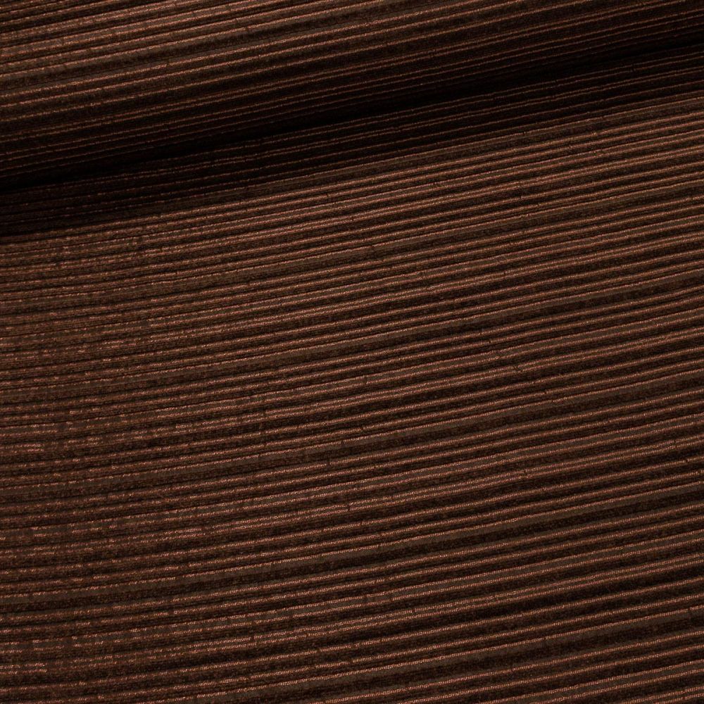 Potahová látka je tkaná žinylkovou přízí v proužcích v hnědých odstínech. Potahovka je v šířce 140 cm a je vyrobena ze 100% polyesteru (gramáž 345g/m2). Látka je jemná a je jednolící.