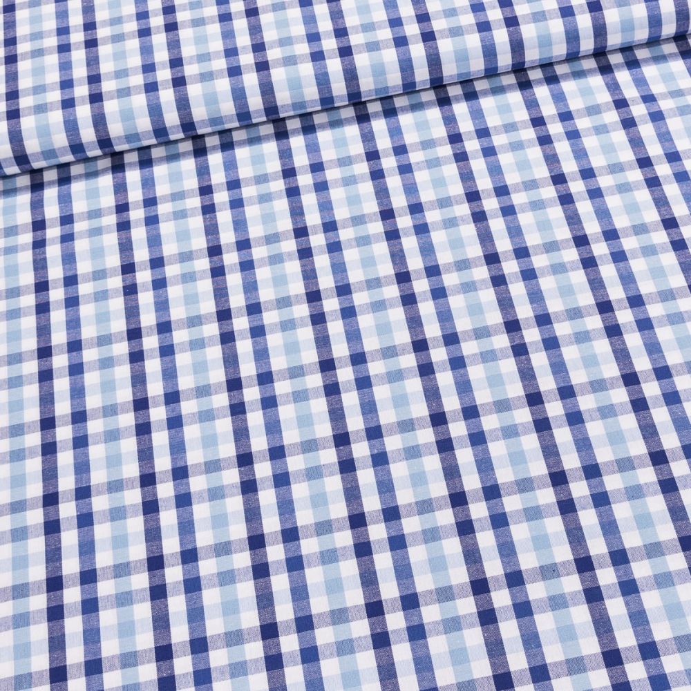 Bavlněný kanafas od českého výrobce károvaný, pestře tkaný (1 cm) v modré barvě. Látka je v šířce 140 cm, vyrobena ze 100% bavlny (gramáž 177g/m2) v plátnové vazbě. Vzor látky je vytkávaný, a je tedy z obou stran stejný.