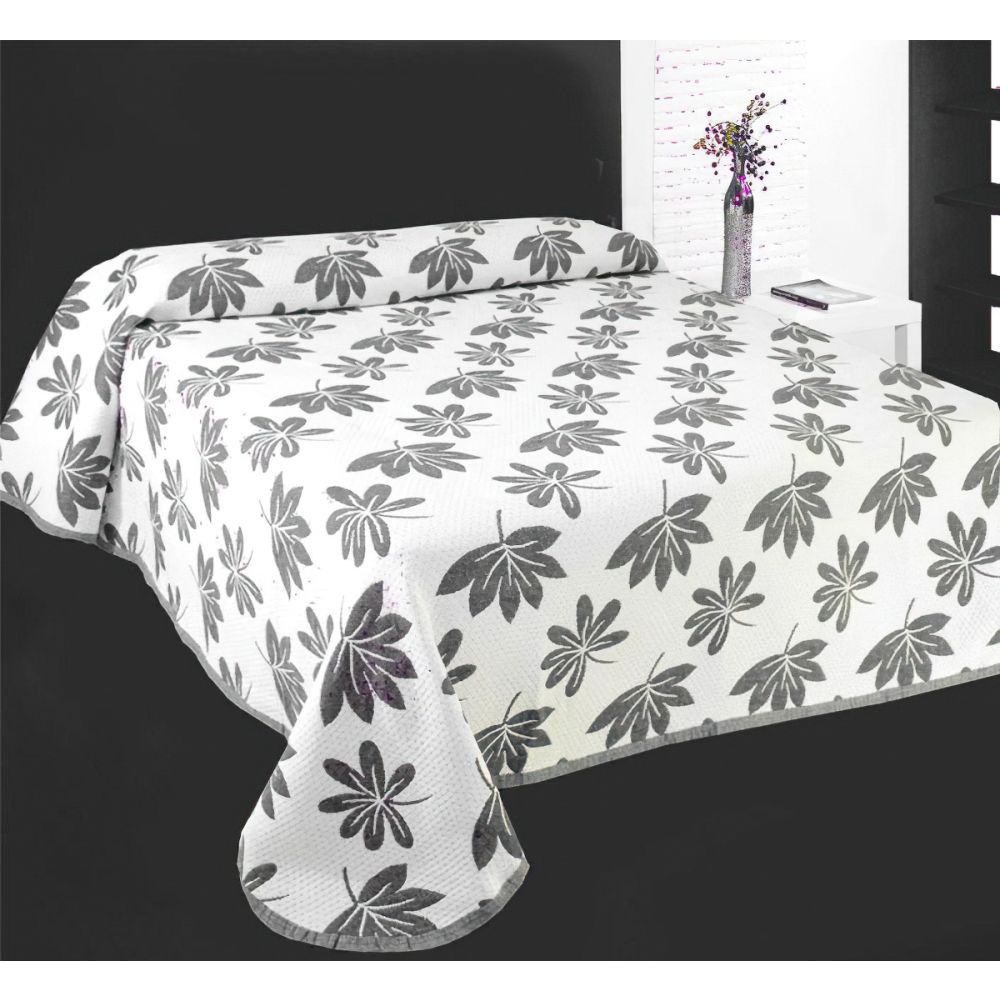 Přehoz na postel EVA šedo-bílý s listy, 240x260cm, dvojlůžko