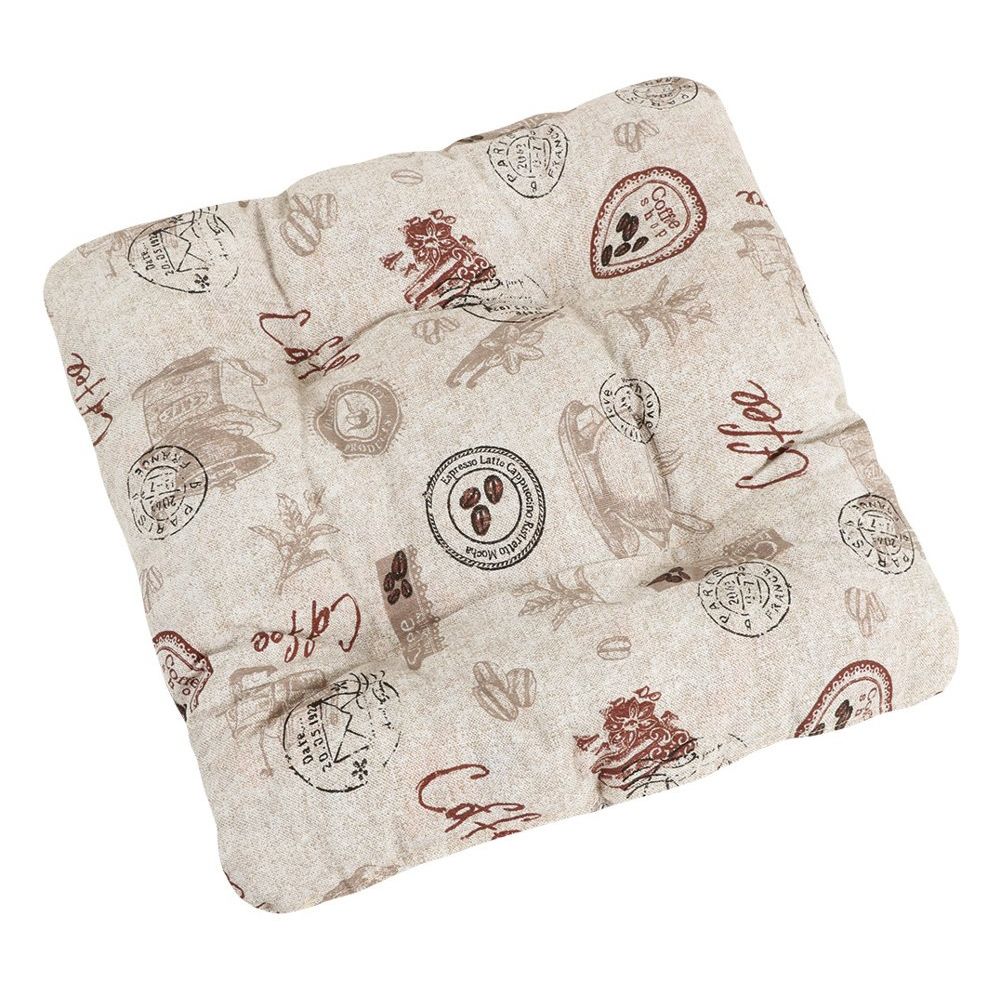 Prošívaný čtvercový sedák s kávovými motivy na béžovém pozadí v rozměru 40x40cm s výškou cca 8 cm. Sedák je vyroben z kvalitního materiálu s vysokou odolností proti prosezení a je opatřen provázky pro pevné přichycení k židli. Je vhodný jako dekorační prvek do kuchyně nebo na zahradu pro příjemné sezení. Povlak podsedáku je vyrobený z kombinace 50 % bavlny. 30 % polyesteru a 20 % lnu, výplň je tvořena ze 100% polyuretanu (rouno z dutého vlákna).