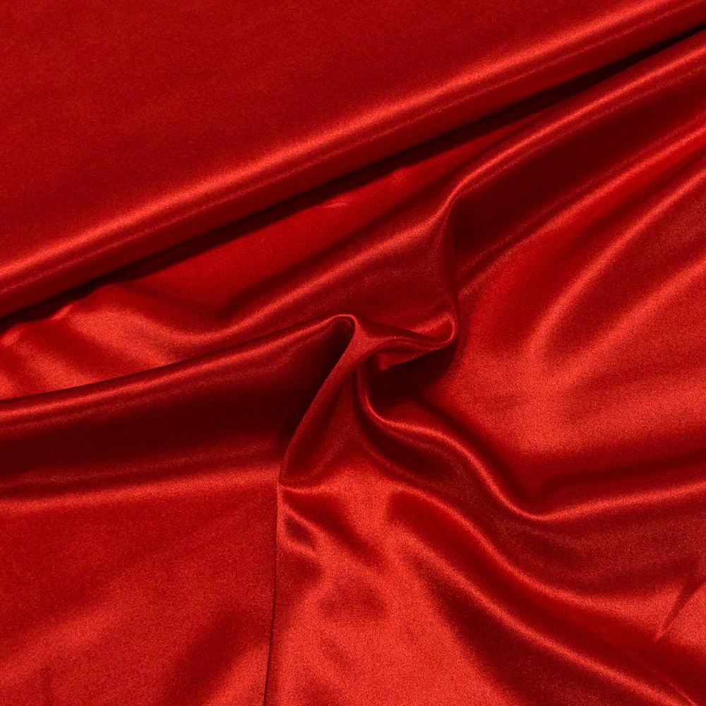 Elastický polyesterový satén v jednobarevné lesklé červené barvě. Látka je v šířce 150 cm, vyrobena z 97% polyesteru a 3% elastanu. Látka je z jedné strany lesklá, z druhé strany je matná.