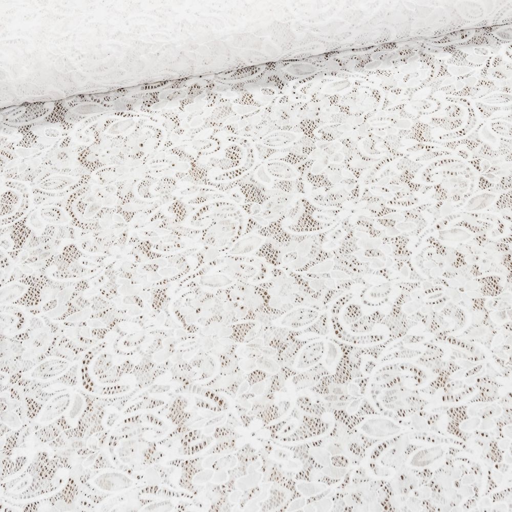 Látka, elastická krajka v bílé barvě. Krajka je v šířce 150 cm a je vyrobena z 90% nylonu a 10% elastanu. Látka je vhodná na plesové a společenské halenky, topy, šaty a sukně.
