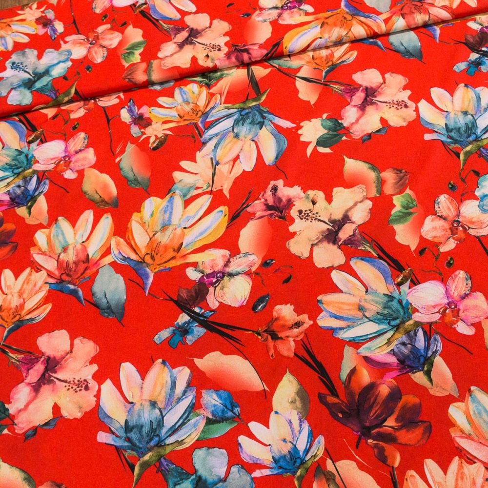 Směsová látka (šatovka) s motivem barevných květů na červeném podkladu. Šatovka je v šířce 150 cm a je vyrobena z 80% polyesteru, 15% viskózy a 5% elastanu (gramáž 120g/m2). Látka je vhodná na letní kostýmky, tuniky, halenky, topy, šaty, sukně či kalhoty. Látka má vzor z jedné strany, z druhé strany je bez potisku.