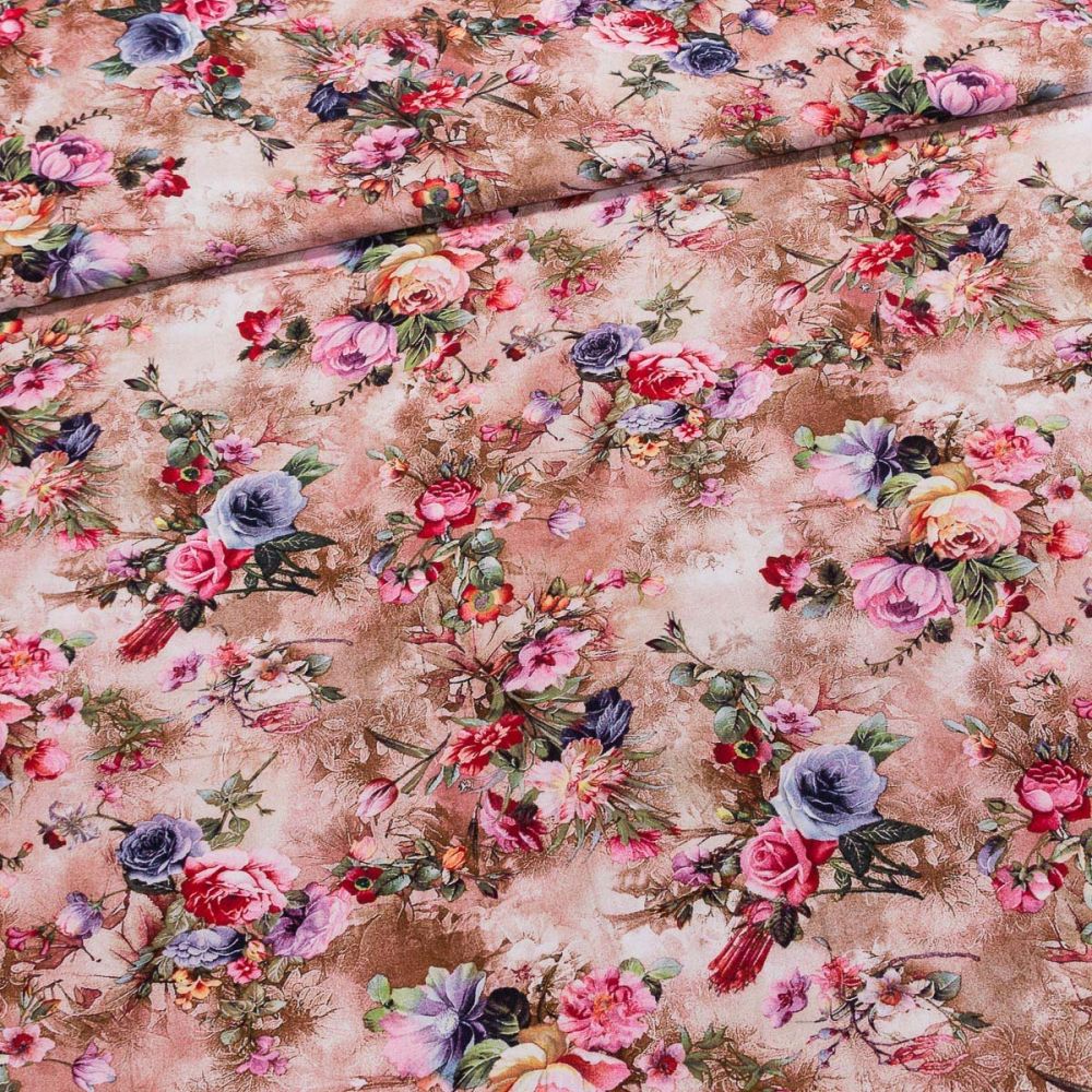 Šatovka viskózová 2073, barevné květy na béžové, š.140cm (látka v metráži)