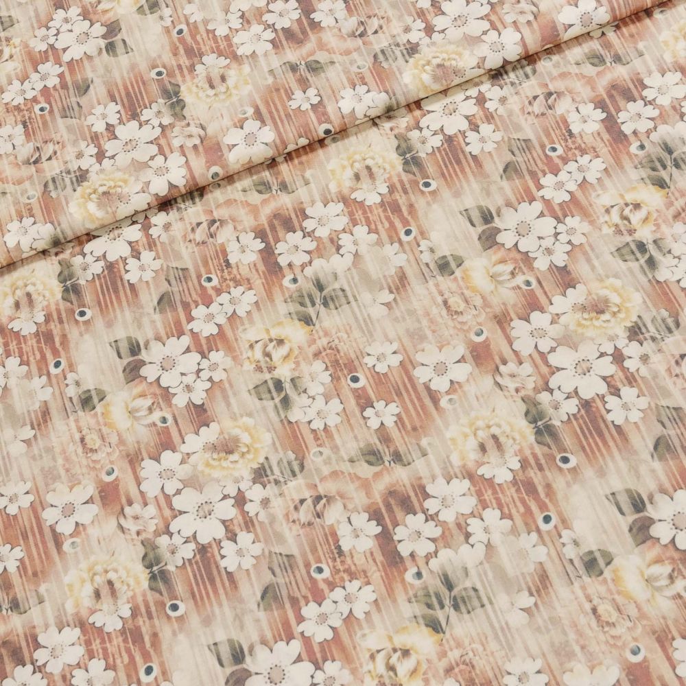 Viskózová látka (šatovka) se vzorem květů v béžových odstínech. Šatovka je v šířce 140 cm a je vyrobena ze 100% viskózy (Tencel-přírodní materiál) (gramáž 120g/m2) v keprové vazbě. Látka je vhodná na letní kostýmky, tuniky, halenky, topy, šaty, sukně či kalhoty. Látka má vzor jen z jedné strany.