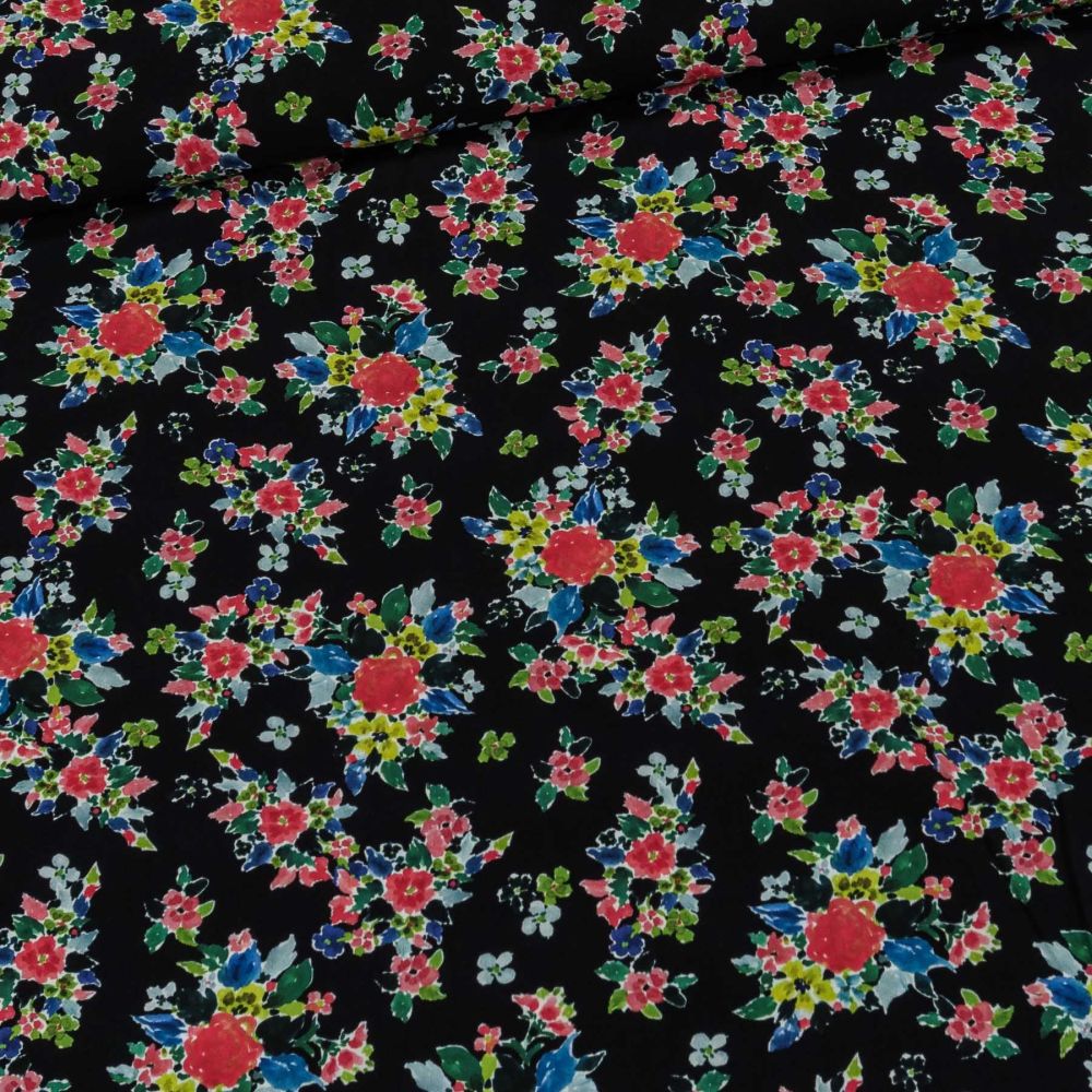 Šatovka viskózová 5233-001, červeno-modré květinky na černé, š.138cm (látka v metráži)