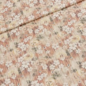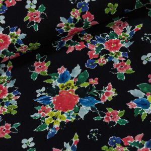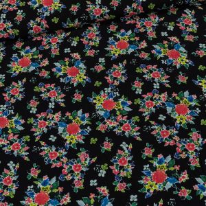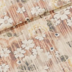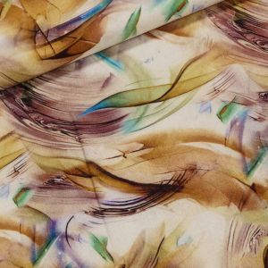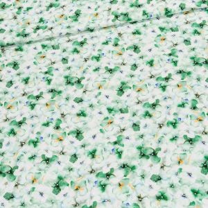 Viskózová látka (šatovka) s digitálně tištěným vzorem fialových a růžových motýlků s květinami. Šatovka je v šířce 150 cm a je vyrobena ze 100% viskózy (gramáž 120g/m2). Látka je vhodná na letní kostýmky, tuniky, halenky, topy, šaty, sukně či kalhoty. Látka má vzor jen z jedné strany.