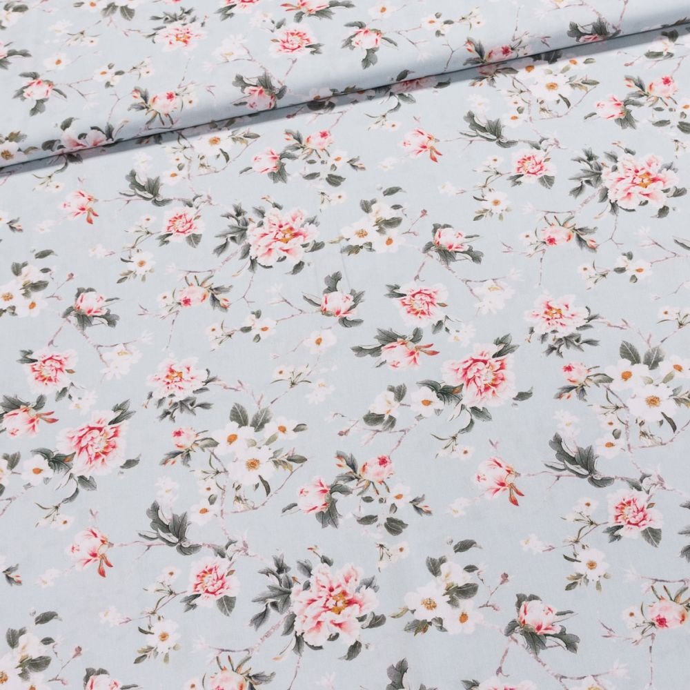 Šatovka viskózová 9539-001 DIGITÁLNÍ TISK, pivoňky a bílé květy na světle modré, š.140cm (látka v metráži)