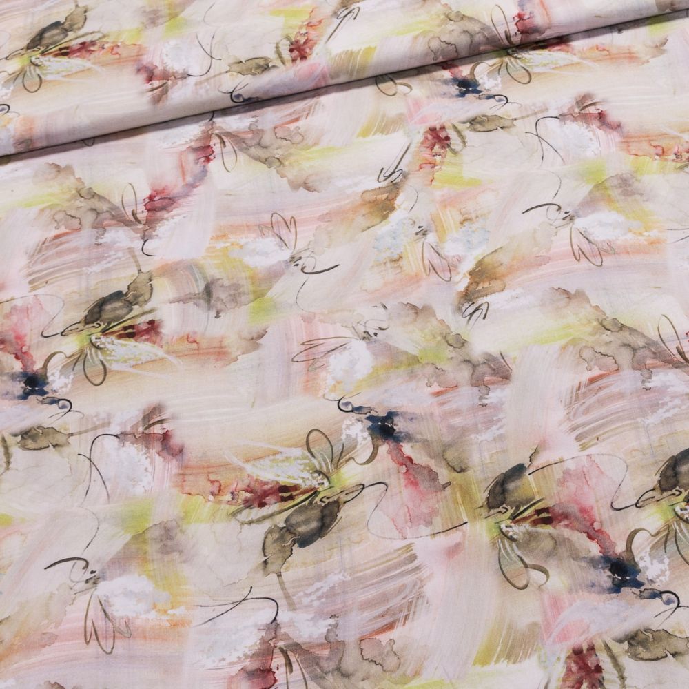 Viskózová látka (šatovka). Šatovka je v šířce 140 cm a je vyrobena ze 100% viskózy (gramáž 110g/m2). Látka je vhodná na letní kostýmky, tuniky, halenky, topy, šaty, sukně či kalhoty. Látka má vzor z jedné strany, z druhé strany je bez potisku.. Lze prát na 40°C v pračce a žehlit, nesmí se sušit v sušičce.