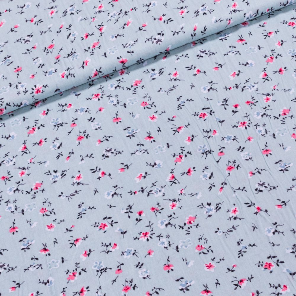 Viskózová látka se vzorem růžových a modrých drobných květinek na mentolovém pozadí. Látka je lehká vhodná na výrobu šatů, sukní, halenek, košilí, košilových šatů či lehkých kalhot. Látka je v šířce 140 cm, vyrobena ze 100% viskóza (120g/m). Látka má vzor z jedné strany z druhé strany je bez potisku.
