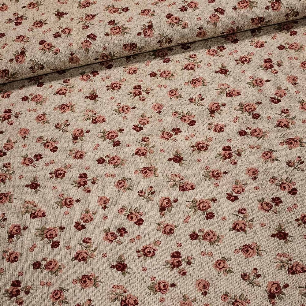 Směsové plátno 2020-44-A růžičky na béžovém melíru, růžová, š.140cm (látka v metráži)