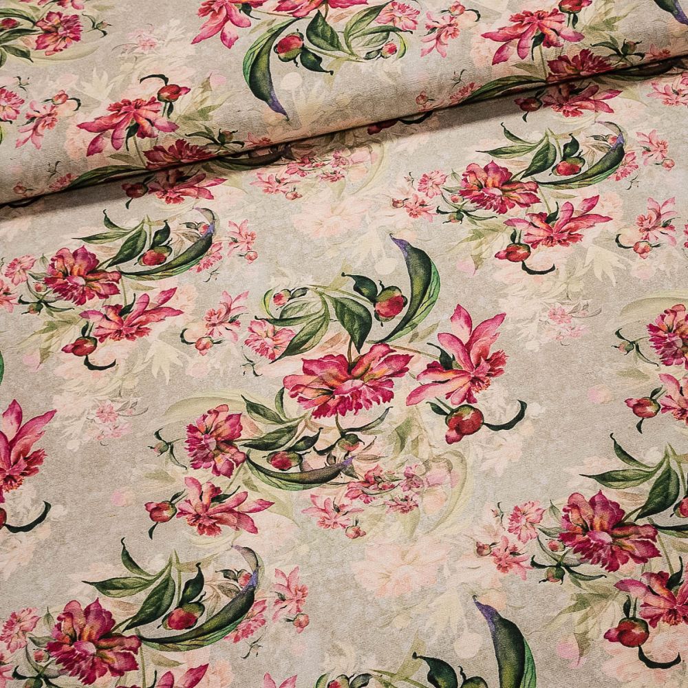 Směsové plátno 2020-FLOWER P3, růžové květy s listy na režné, š.140cm (látka v metráži)