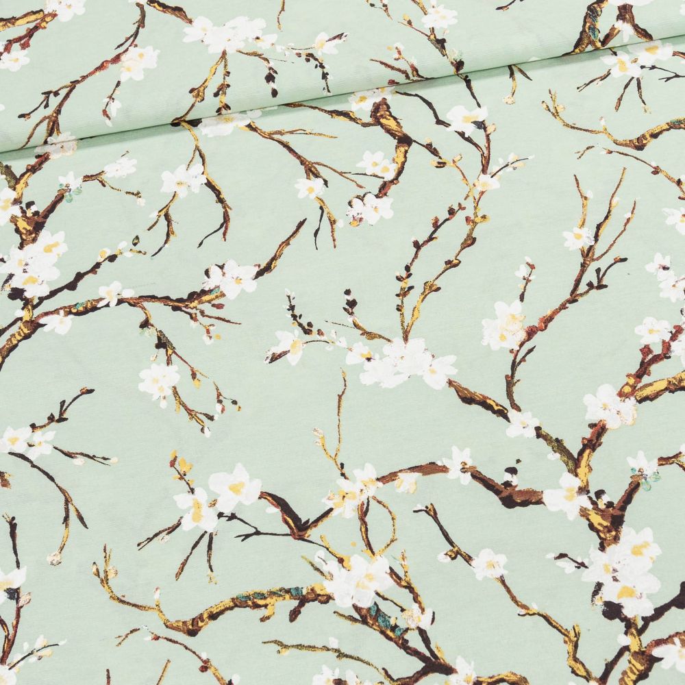 Směsová látka (tkanina) se vzorem třešňových větviček s bílými kvítky na podkladu v mentolové barvě. Látka je v šířce 140 cm a je vyrobena z 55% bavlny a 45% polyesteru. Motiv na látce je pouze z jedné strany, z druhé je látka bez potisku.