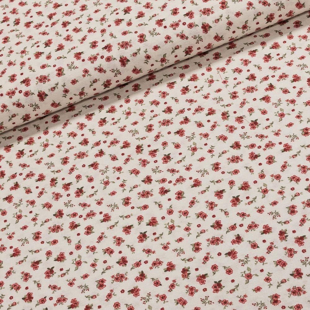 Směsová látka (tkanina) se vzorem drobných červených kvítků na krémovém podkladě. Látka je v šířce 140 cm a je vyrobena z 55% bavlny a 45% polyesteru. Motiv na látce je pouze z jedné strany, z druhé je látka bez potisku.