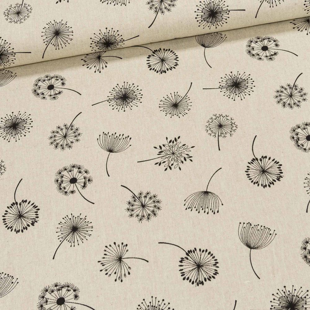 Směsové plátno CALIPSO BLOOM, černé chmýří pampelišky na režné, š.140cm (látka v metráži)