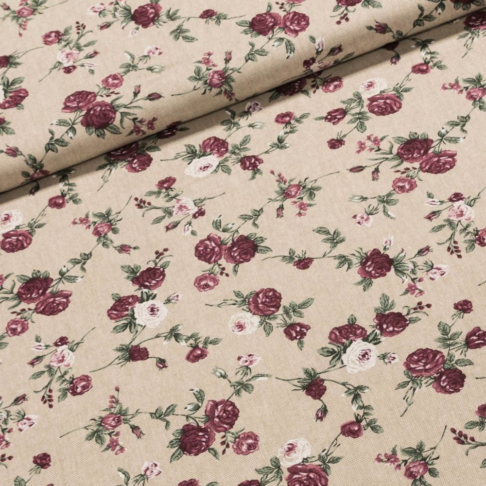 Směsové plátno ELAIA 29 vínové růže na režné, š.140cm (látka v metráži)