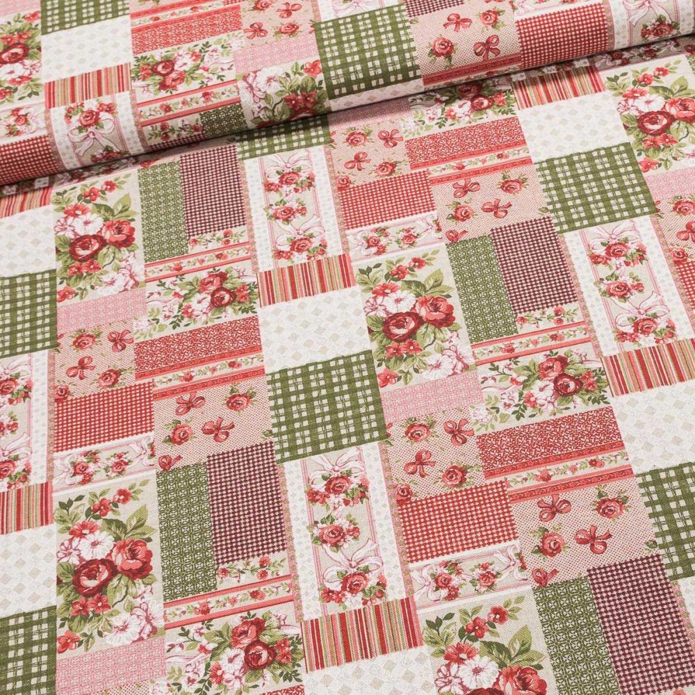 Směsová látka (tkanina) se vzorem patchworku v červených a zelených barvách. Látka je v šířce 140 cm a je vyrobena z 70% bavlny a 30% polyesteru. Motiv na látce je pouze z jedné strany, z druhé je látka bez potisku.