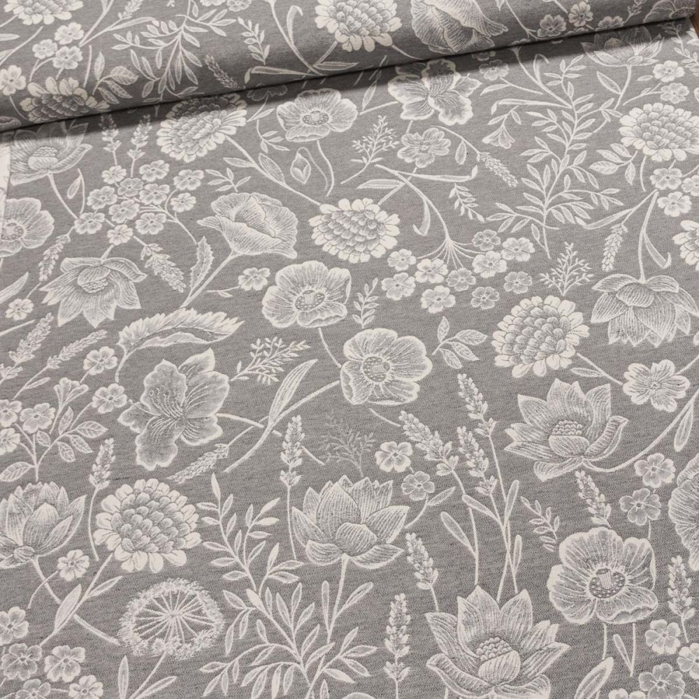 Směsová látka (tkanina) gobelín oboustranná se vzorem šedých a bílých květů. Látka je v šířce 140 cm a je vyrobena ze 70% polyesteru a 30% bavlny (310g/m2). Látka je pevná pestře tkaná, vhodná i na sedáky a potahy. Motiv na látce je tkaný a je oboustranný, pozitiv / negativ.