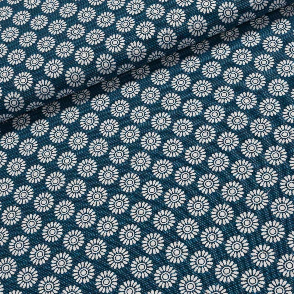 Směsová látka (tkanina) gobelín se vzorem bílých kopretin na tmavě tyrkysovém podkladu. Látka je v šířce 140 cm a je vyrobena ze 70% polyesteru a 30% bavlny (220g/m2). Látka je pevná pestře tkaná, vhodná i na sedáky a potahy. Motiv na látce je tkaný a je oboustranný, pozitiv / negativ.