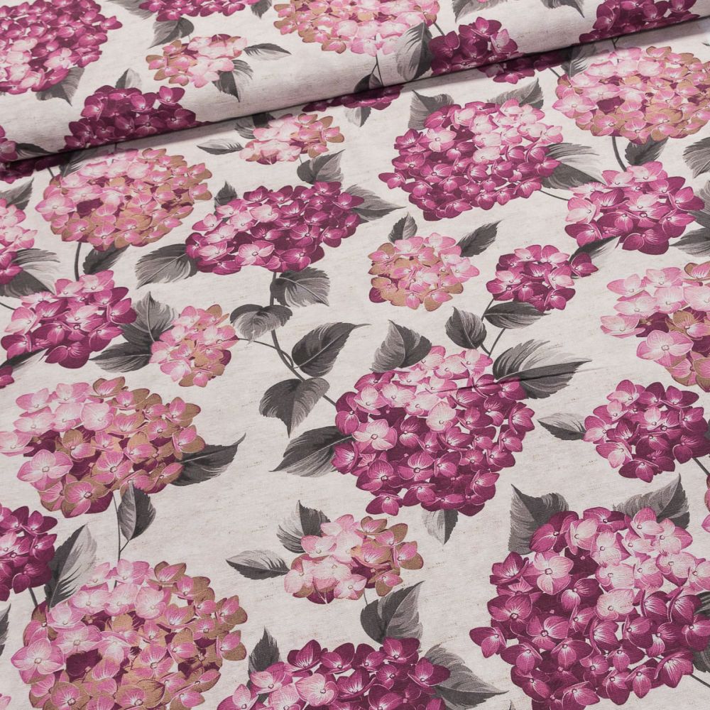 Směsová látka (tkanina) se vzorem tmavě růžových hortenzií. Látka je v šířce 140 cm a je vyrobena z 55% bavlny a 45% polyesteru. Motiv na látce je pouze z jedné strany, z druhé je látka bez potisku.
