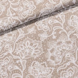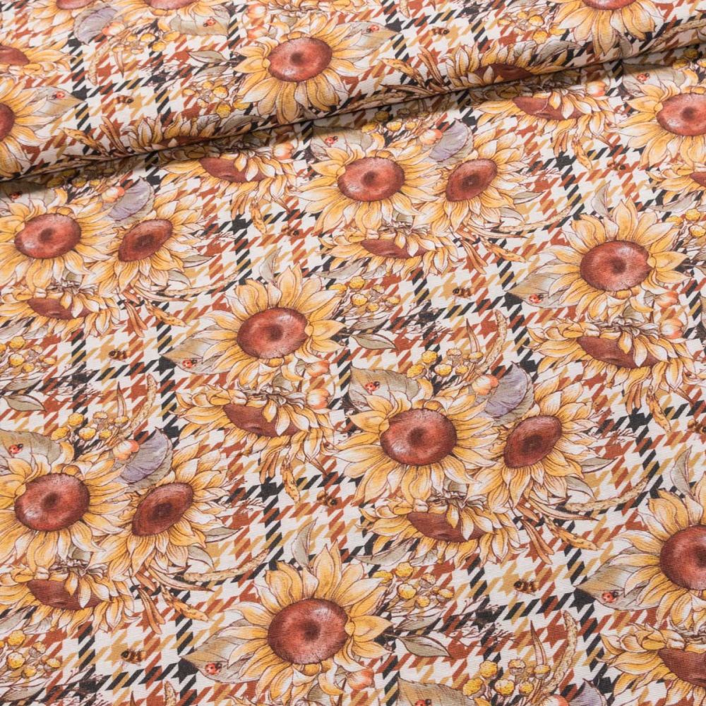Směsová látka (tkanina) v kombinaci vzoru kohoutí stopy a slunečnice v oranžovo-hnědé barvě. Látka je v šířce 140 cm a je vyrobena z 55% bavlny a 45% polyesteru. Motiv na látce je pouze z jedné strany, z druhé je látka bez potisku.