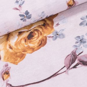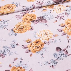 Směsová látka (tkanina) se vzorem růžových višňových květů na béžovém podkladu. Látka je v šířce 140 cm a je vyrobena z 55% bavlny a 45% polyesteru. Motiv na látce je pouze z jedné strany, z druhé je látka bez potisku.