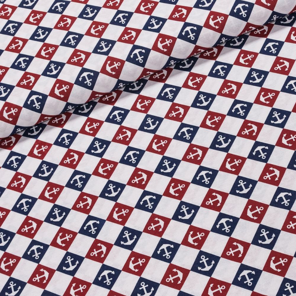 Směsová látka (tkanina) se vzorem kotviček v červených a modrých kosočtvercích na bílém podkladu. Látka je v šířce 140 cm a je vyrobena z 55% bavlny a 45% polyesteru. Motiv na látce je pouze z jedné strany, z druhé je látka bez potisku.