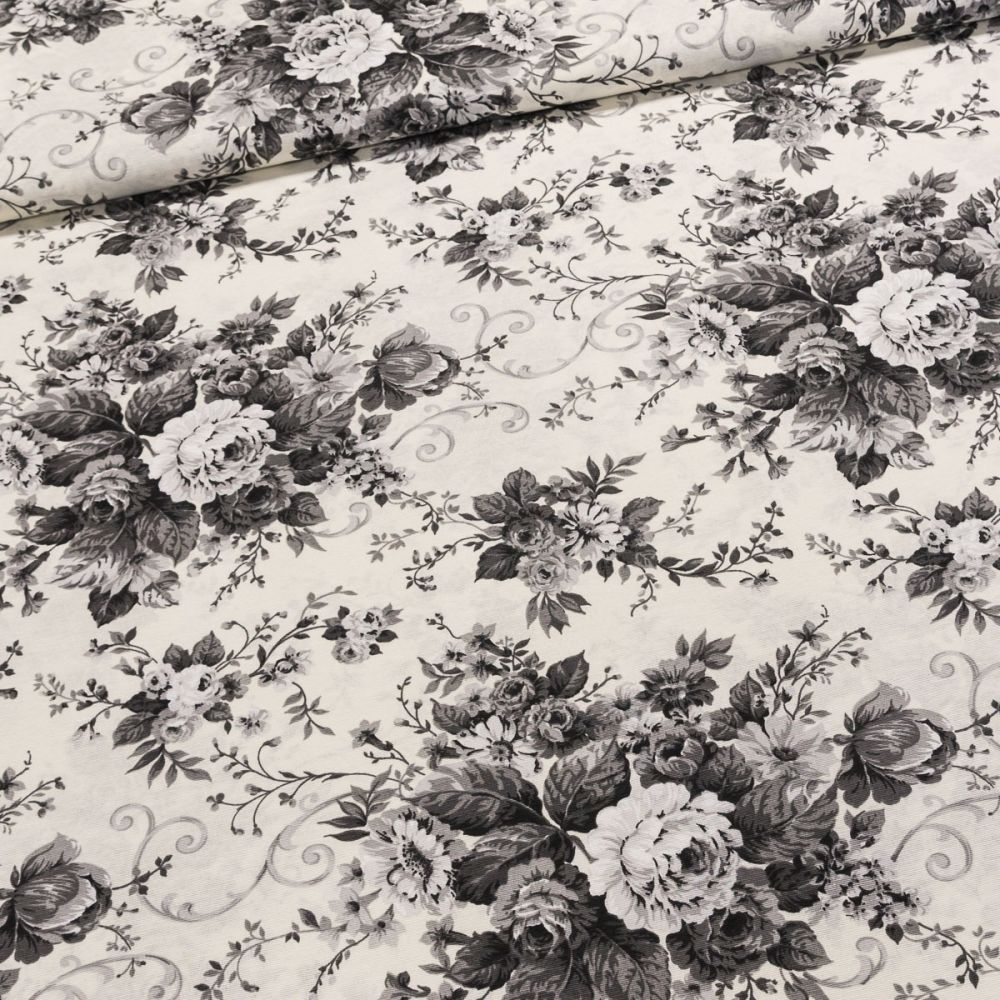 Směsové plátno ROSA ČERNÁ, šedé růže na smetanové, š.140cm (látka v metráži)