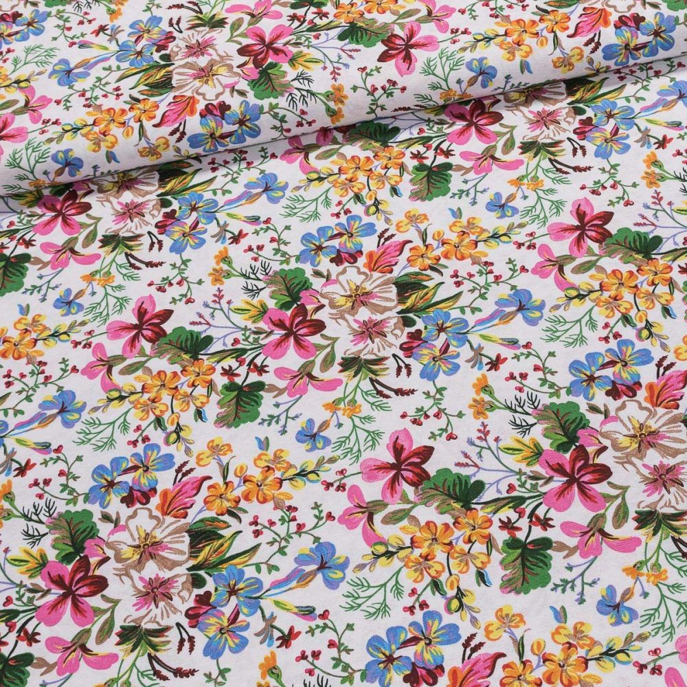Směsová látka (tkanina) se vzorem směsicí barevných květin ve žlutých, růžových a modrých barvách na bílém pozadí. Látka je v šířce 140 cm a je vyrobena z 55% bavlny a 45% polyesteru. Motiv na látce je pouze z jedné strany, z druhé je látka bez potisku.