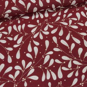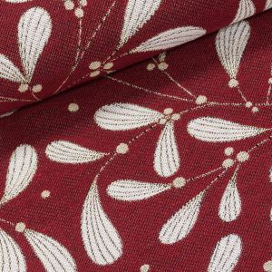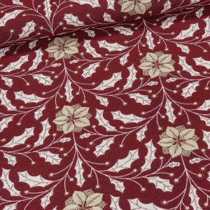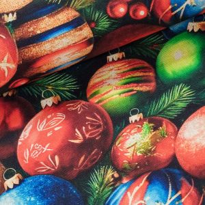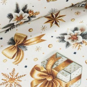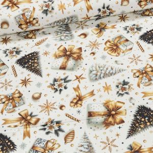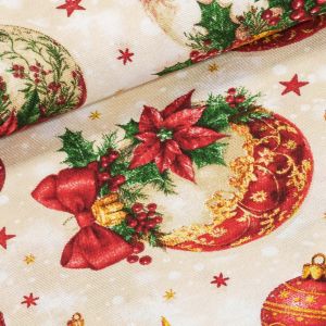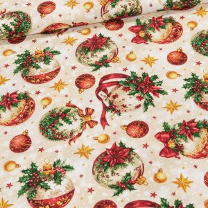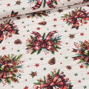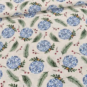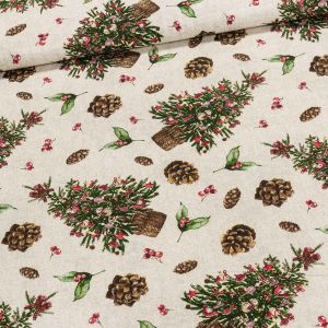 Směsová vánoční látka (tkanina) s motivem stromečků, mahonky a větviček se šiškami v zelených barvách na smetanovém podkladu. Látka je v šířce 140 cm a je vyrobena z 55% bavlny a 45% polyesteru. Motiv na látce je z jedné strany, z druhé strany je bez potisku..