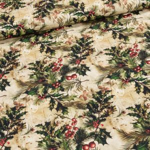 Směsové plátno vánoční CH25-008, stromeček a mahonka na smetanovém podkladu s větvičkami, zelená, š.140cm (látka v metráži)