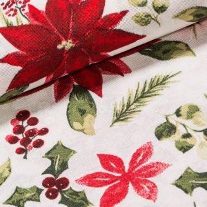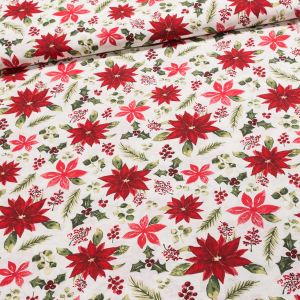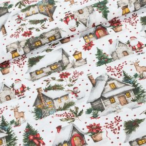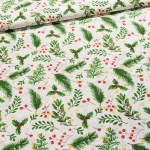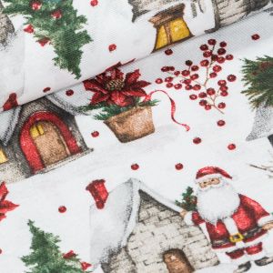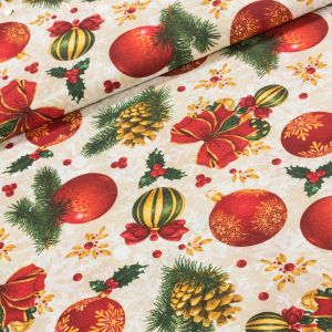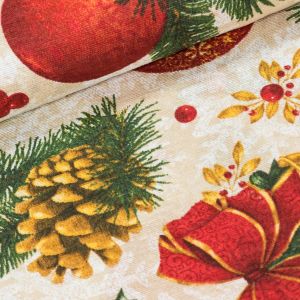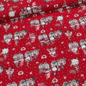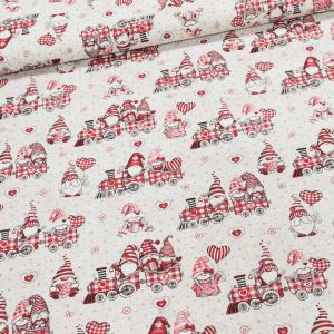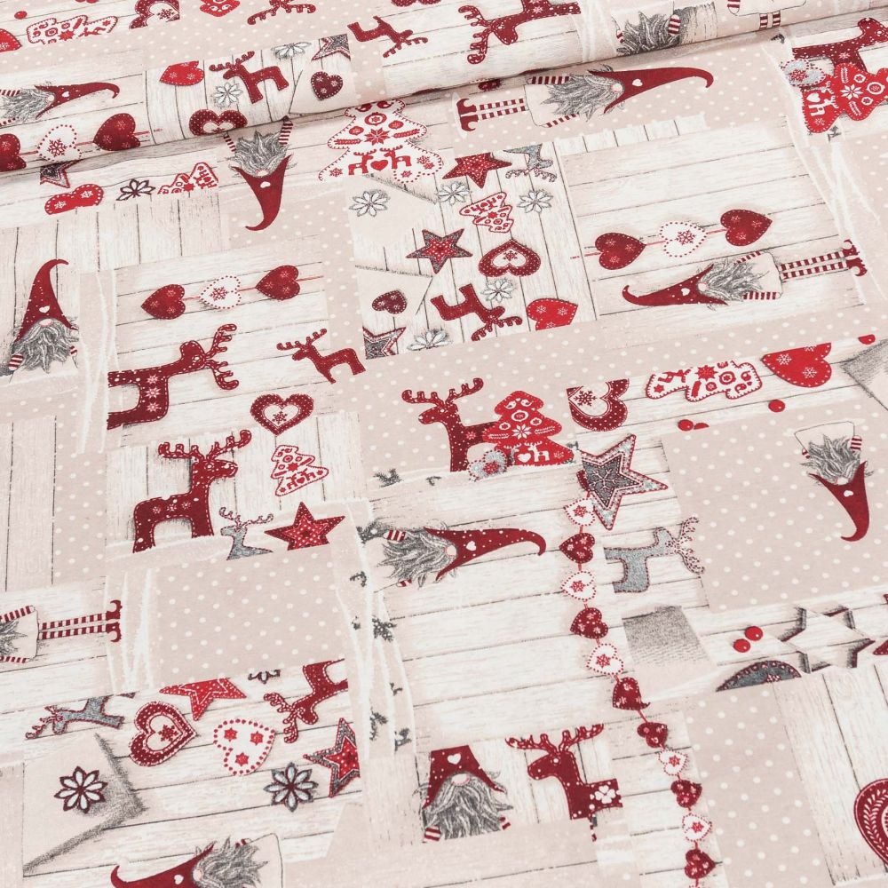 Směsová vánoční látka (tkanina) s motivem červených skřítků na béžovém dřevě. Látka je v šířce 140 cm a je vyrobena ze 70% bavlny a 30% polyesteru. Motiv na látce je z jedné strany, z druhé strany je bez potisku..