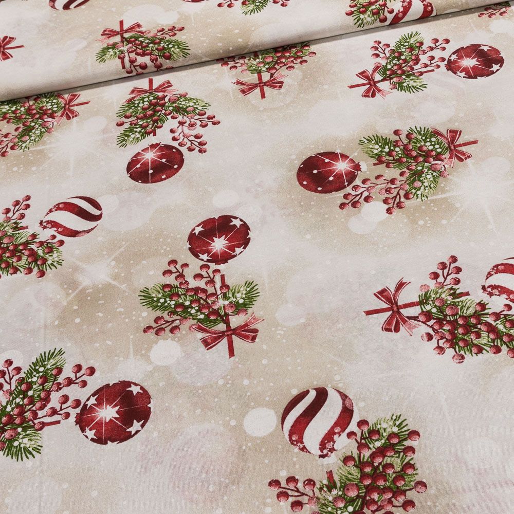 Směsová látka (tkanina) červené vánoční baňky a jmelí na režném podkladu. Látka je v šířce 140 cm a je vyrobena z 55% bavlny a 45% polyesteru. Motiv na látce je pouze z jedné strany, z druhé je látka bez potisku.