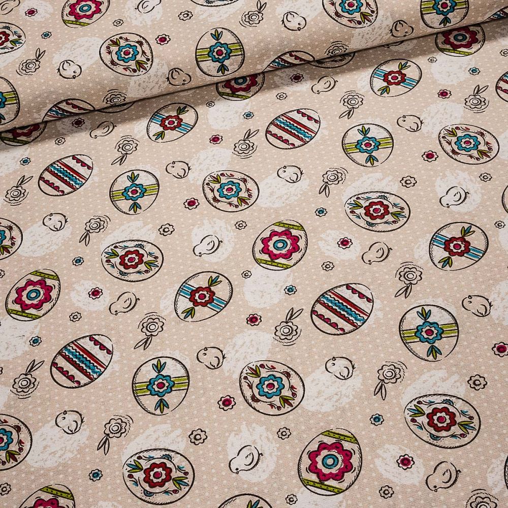 Směsová látka (tkanina) se vzorem kraslic na béžovém podkladu s puntíky. Látka je v šířce 140 cm a je vyrobena z 55% bavlny a 45% polyesteru. Motiv na látce je pouze z jedné strany, z druhé je látka bez potisku.