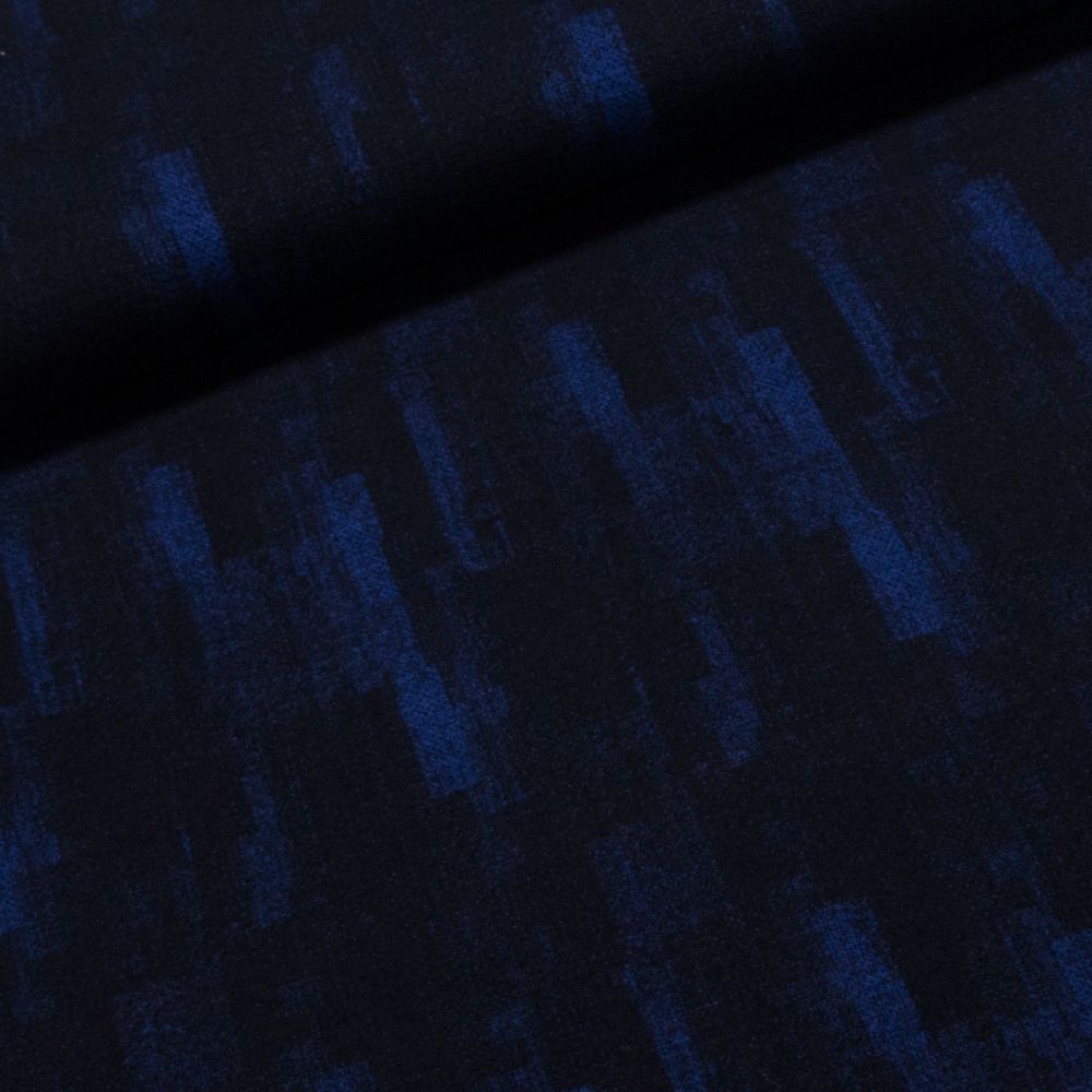 Elastický úplet (jersey) se vzorem modrých šmouh na tmavě modrém podkladu. Úplet je zejména vhodný na šaty, kabátky či sukně. Látka je v šířce 130 cm, vyrobena z 55% viskózy, 30% akrylu, 7% vlny a 8% elastanu (gramáž 200g/m2). Látka je jednostranná.