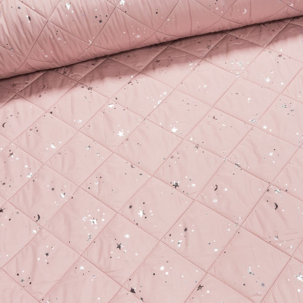 Šusťáková zateplená látka, spodní vrstvu tvoří vatelín a podšívka. Látka je prošívaná do kosočtverců se vzorem stříbrných hvězdiček na růžovém podkladu. Je vhodná na oblečení bundy, kalhoty, vesty. Šusťák je v šířce 140 cm (gramáž 250g/m2) a je vyroben ze 100% polyesteru.