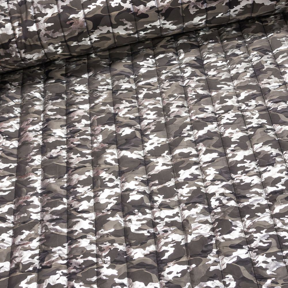 Šusťáková zateplená látka, spodní vrstvu tvoří vatelín a podšívka. Látka je prošívaná do proužků s maskáčovým vzorem v šedo-stříbrné barvě. Je vhodná na oblečení bundy, kalhoty, vesty. Šusťák je v šířce 140 cm (250 g/m2) a je vyroben ze 100% polyesteru.