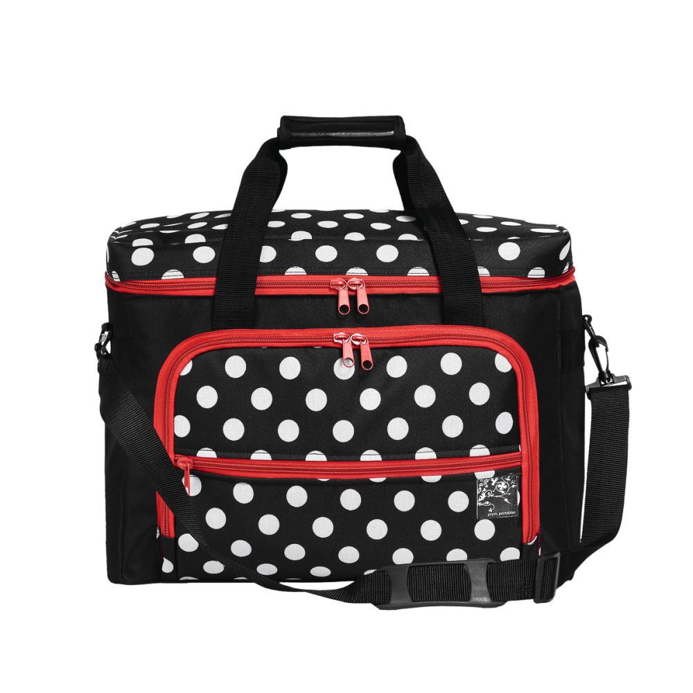 Prostorný a praktický kufr v černé barvě s bílými puntíky a červenými doplňky. Vhodný na domácí šicí stroj, pro transport i skladování. Látková pevná taška má dvě boční kapsy a velkou přední kapsu na zip na uložení pomůcek a nástrojů. Vnitřní popruh se suchým zipem zajistí upevnění stroje a jeho bezpečný převoz. Taška má pevné dno. Taška je kompatibilní s kufrem a kombinace je vhodná zejména při převozu dvou strojů nebo stroje a většího množství materiálu a pomůcek. Rozměry kufru jsou 44x20x35 cm.