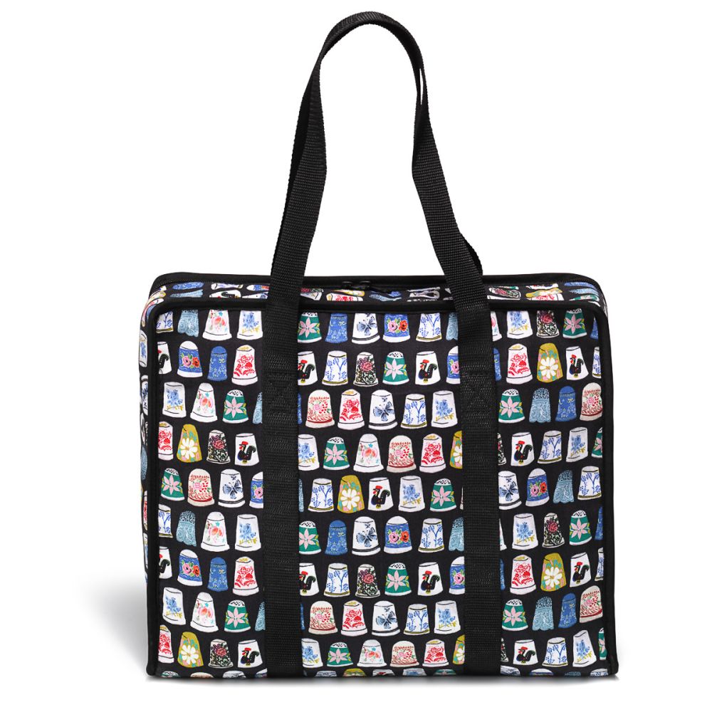 Univerzální látková taška / brašna (All in one) na ukládání nebo přemístění šicích a pletacích pomůcek v černém provedení s motivem barevných náprstků. Taška na šicí potřeby obsahuje 8 vnitřních průhledných kapes, 12 elastických oček a pevná ucha. Látková taška na šití pojme nůžky, jehly, špendlíky, nitě, metry, látky a další krejčovské potřeby. Taška je vyrobena z pevné látky. Rozměry tašky jsou 34 cm x 26 cm a šířka činí 9,5 cm.