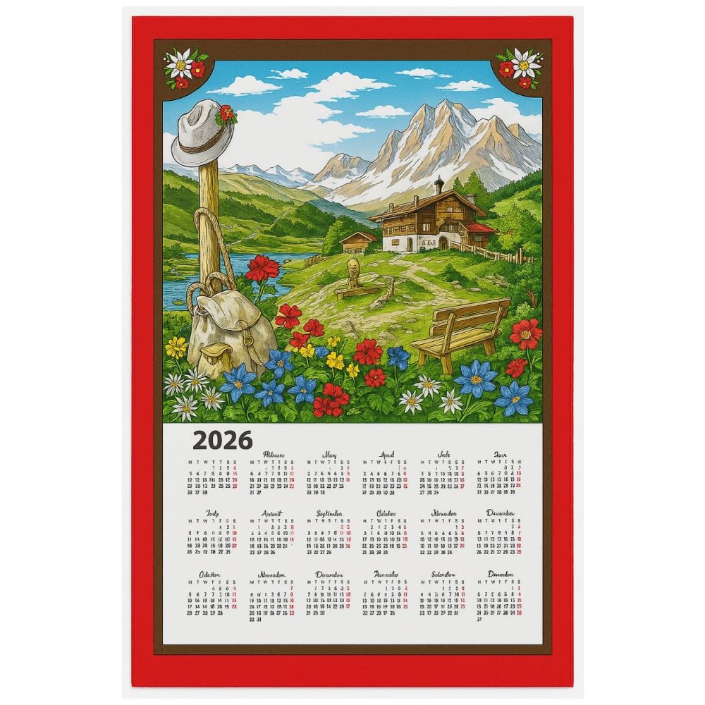 Bavlněný textilní kalendář pro rok 2026 s horským prostředím s červeným okrajem v rozměru 45x65cm. Kalendář poté může sloužit i jako kuchyňská utěrka. Látkový kalendář má jednostranný vzor a je vyroben ze 100% bavlny. Provedení bez hůlky na zavěšení.