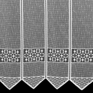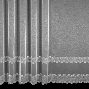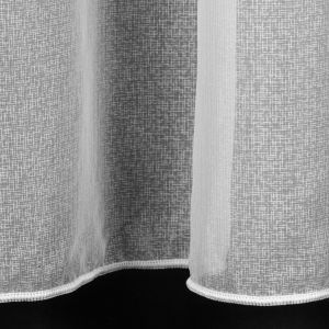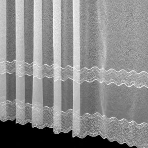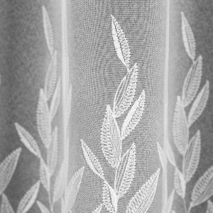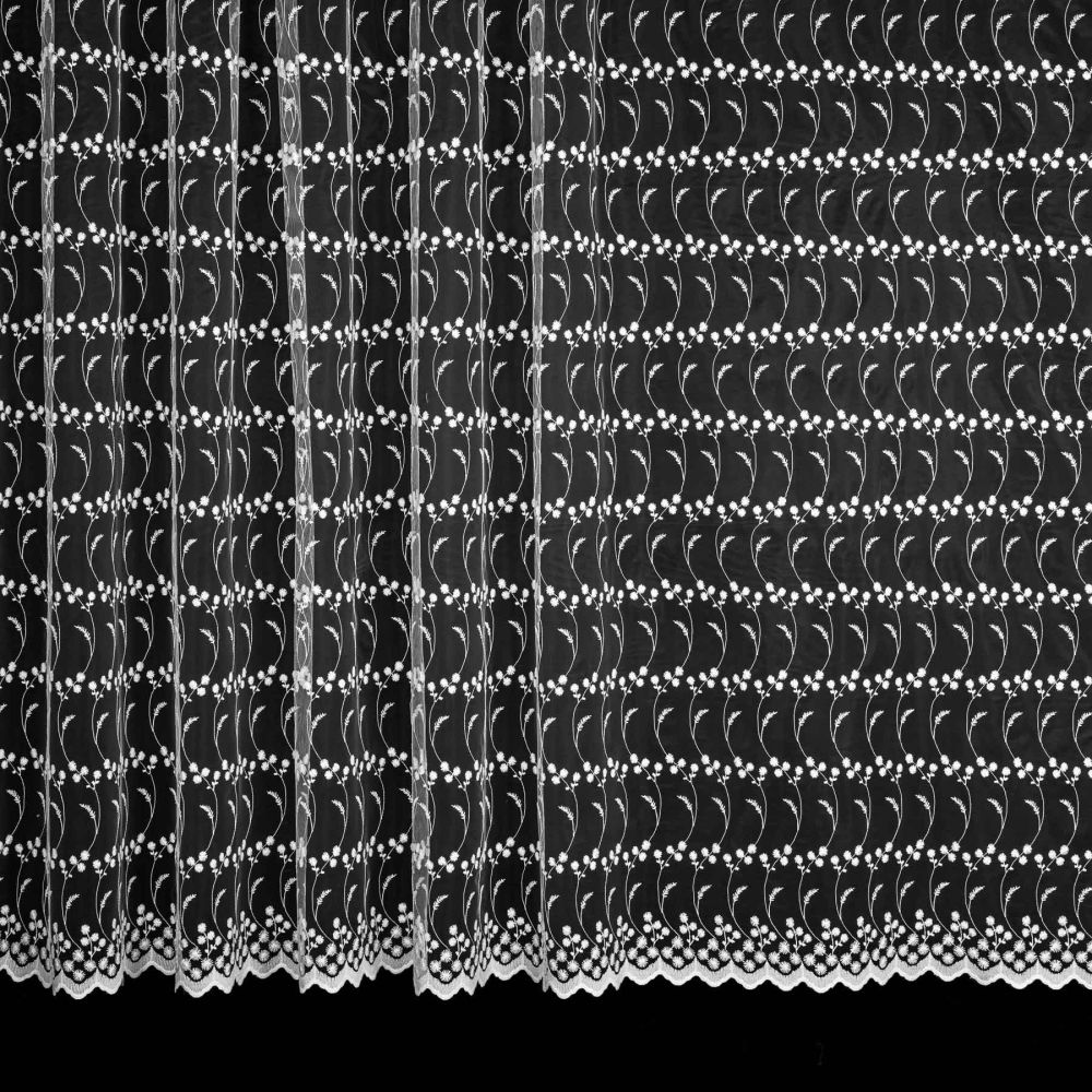 Tylová metrážová záclona se vzorem vyšívaných pnoucích květinek v bílé barvě, zakončená bordurou s obloučky. Záclona je vyrobena ze 100% polyesteru a je dostupná v různých výškách. Výška záclony je měřena v nejdelším místě.