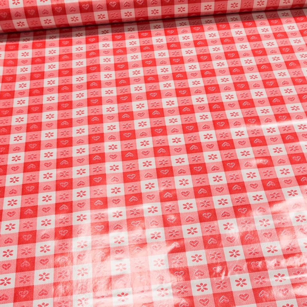 Omyvatelná PVC ubrusovina s podkladem z netkané textilie se vzorem červeno-bílé kostky se srdíčky a květinami s hladkým povrchem. Ubrus je dostupný v metráži o šířce 140cm.